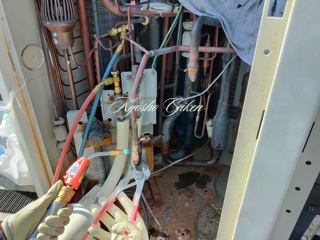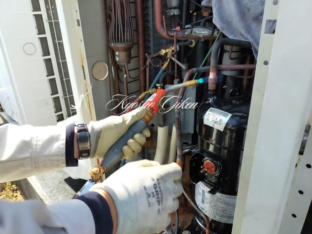圧縮機を取り外した後、切れっぱの配管を溶接で外してきます。