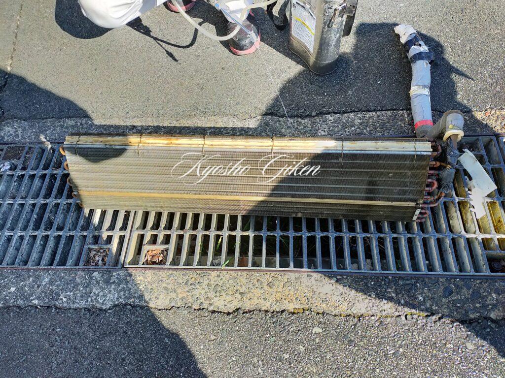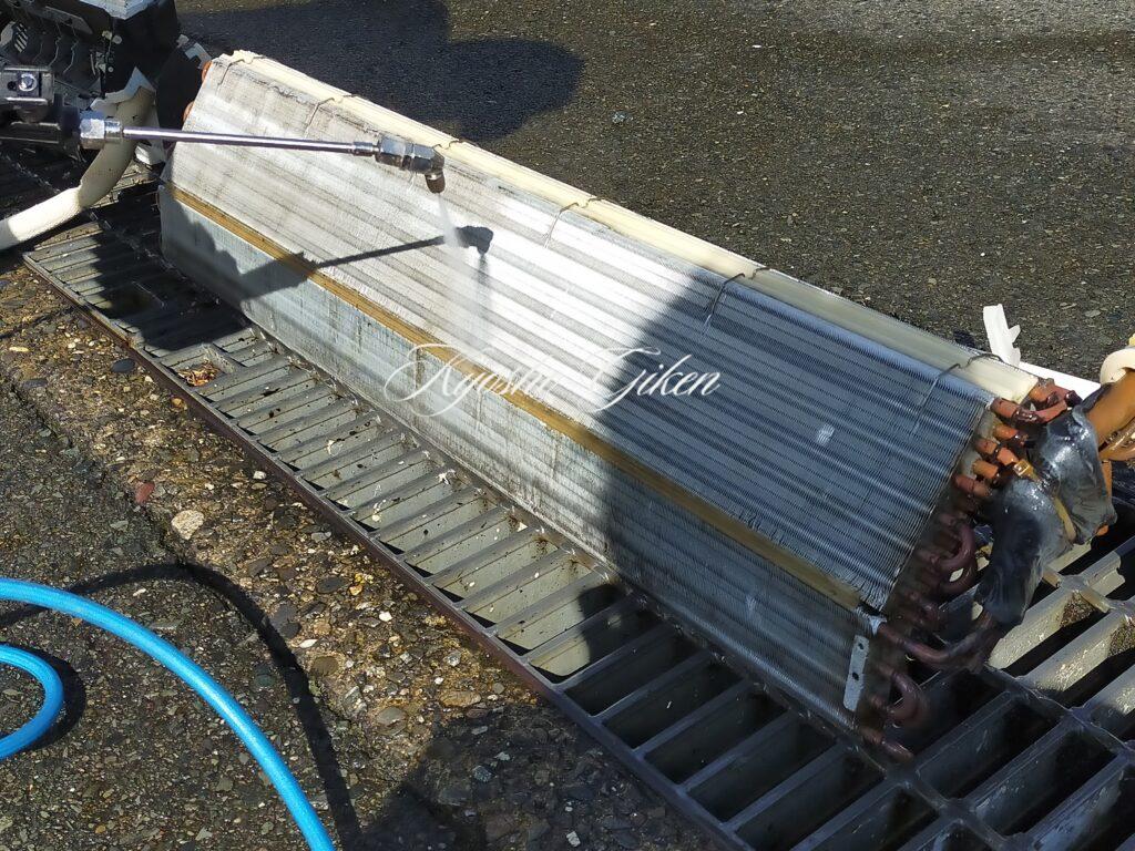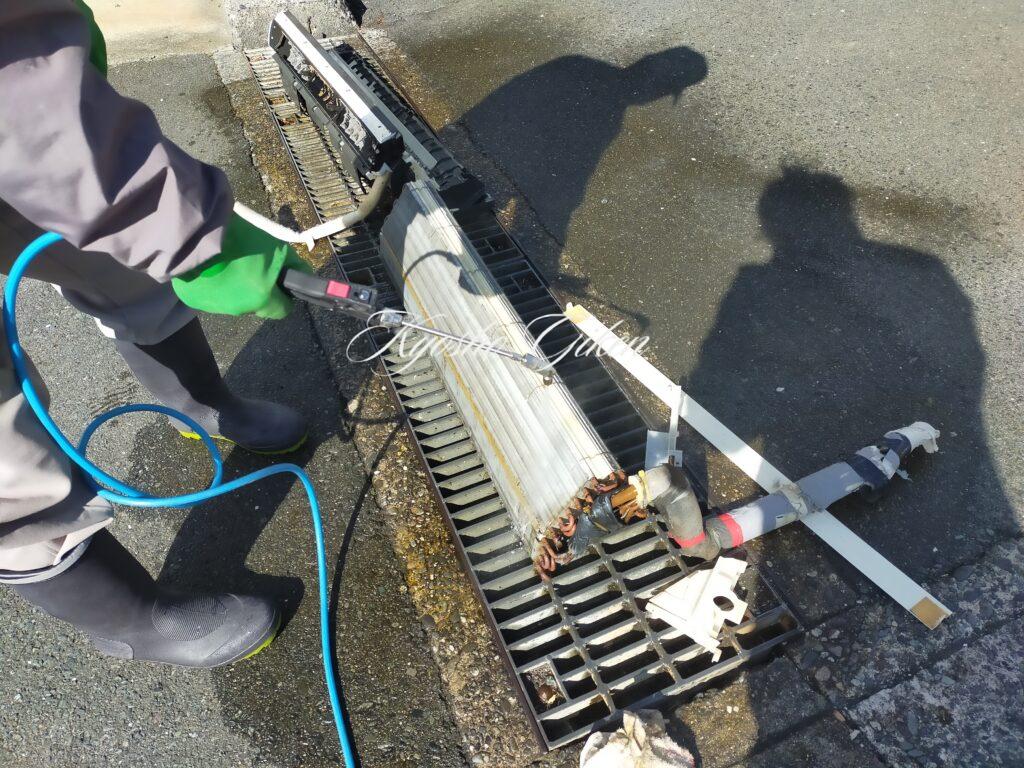 熱交換器も汚れているので、高圧洗浄機で洗浄していきます。