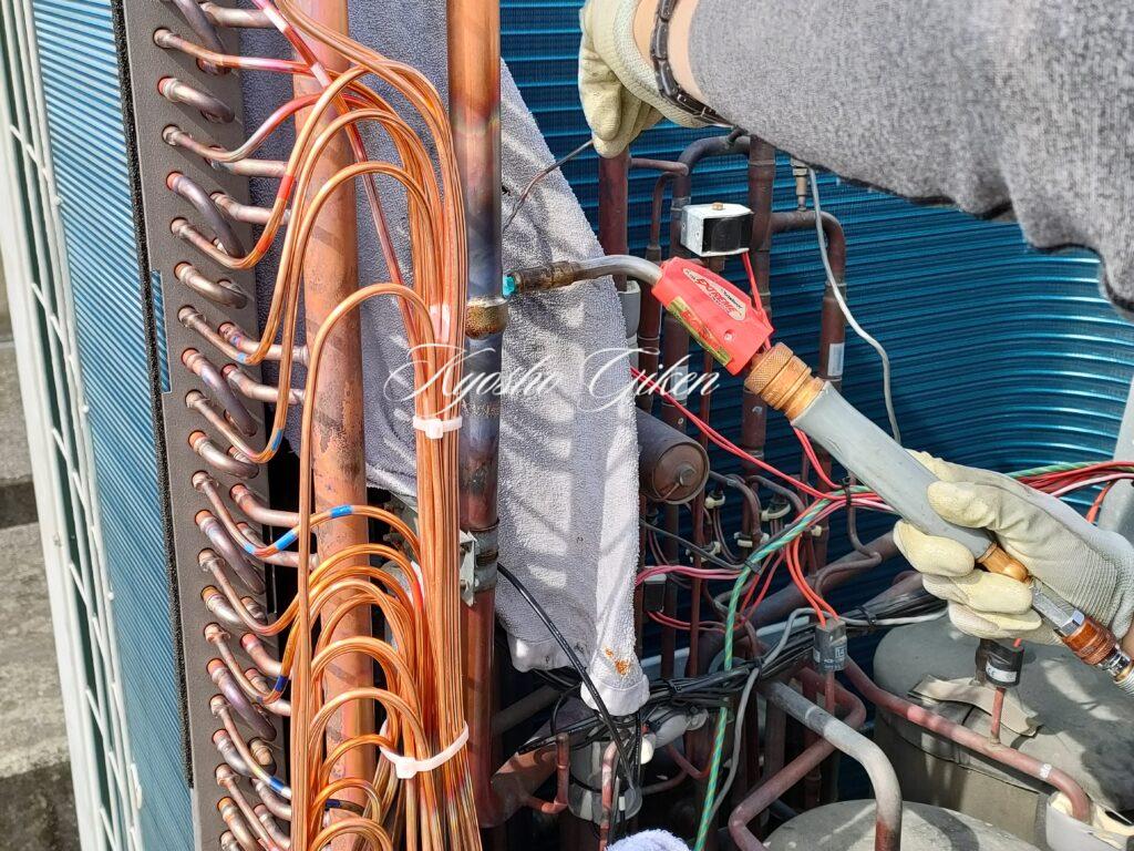 熱交換器と室外機内部の冷媒配管をロウ付けで溶接しているところです。