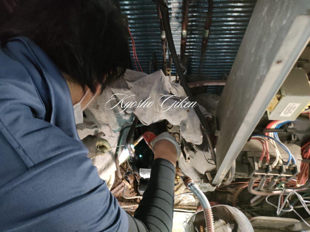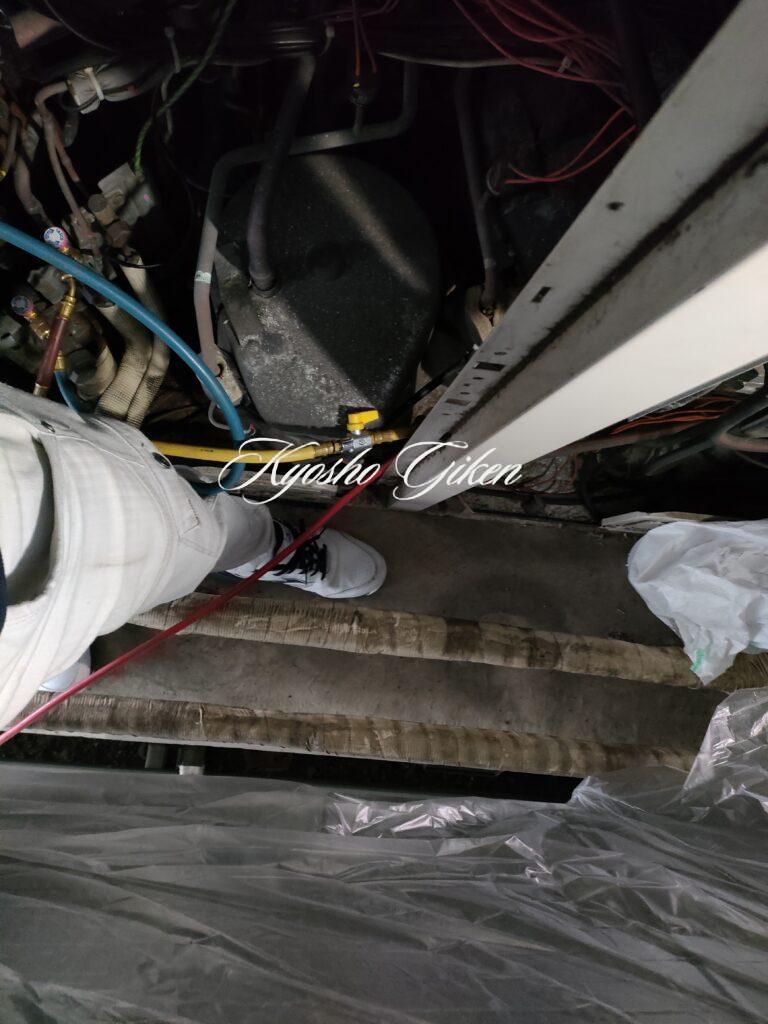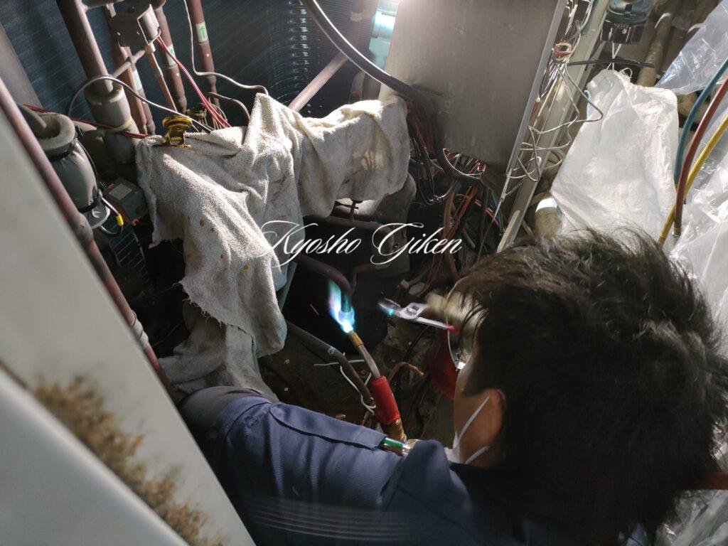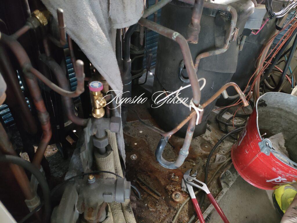 室外機目の前に角ダクトが入っており、なおかつ足元に冷媒配管がある30cmほどしか隙間のない設置場所での圧縮機交換をやりました。