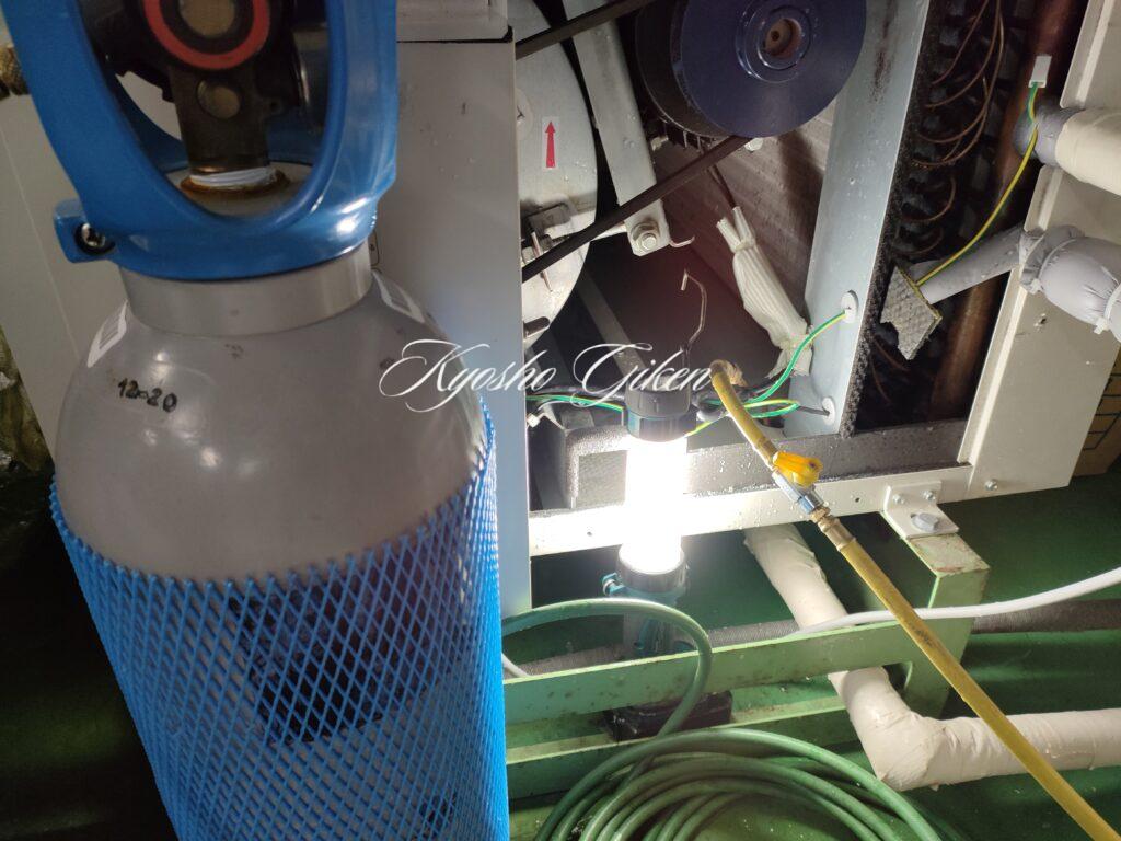 今回、ドレンパンが水ヒタヒタになっておりドレン配管の途中で詰まっている状態だったので、エアブローを実施しました。