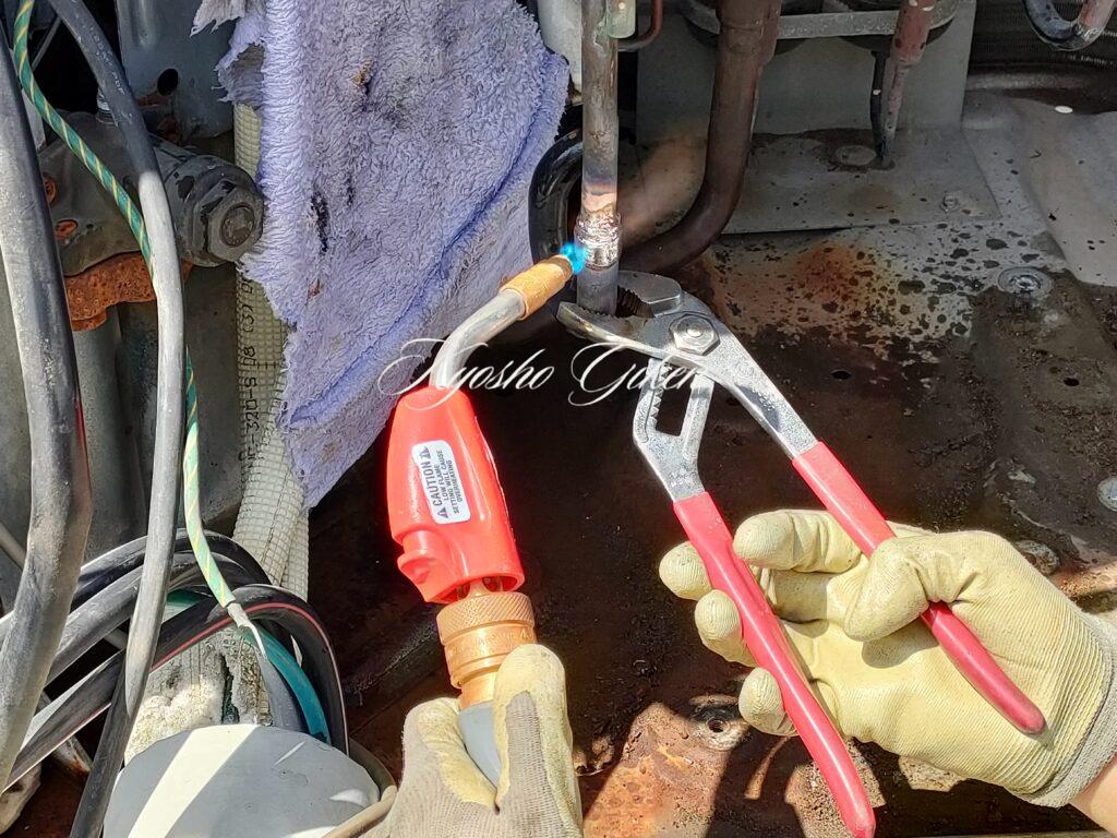 冷凍機油がけっこう出てきたので、あとで洗剤で綺麗に拭きました。そのままにしておくと溶接の時に引火して大変なことになります。