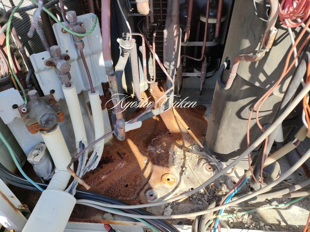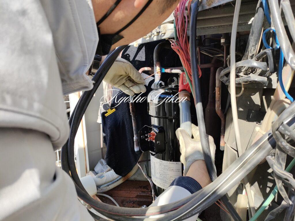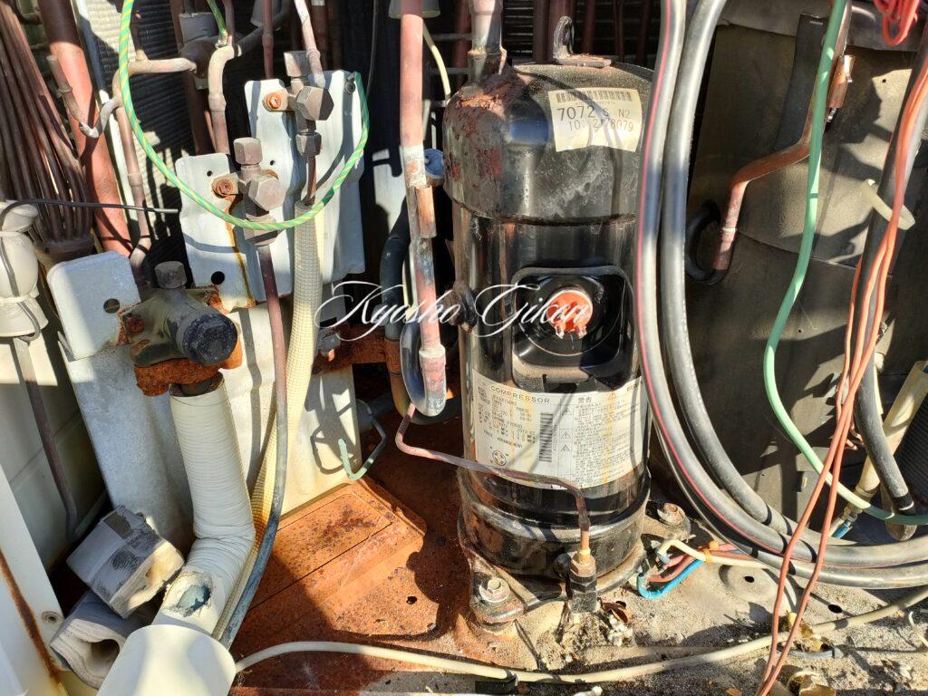 インバータ圧縮機の修理前です。圧縮機の前に電源線もありなかなか修理困難ではあります。