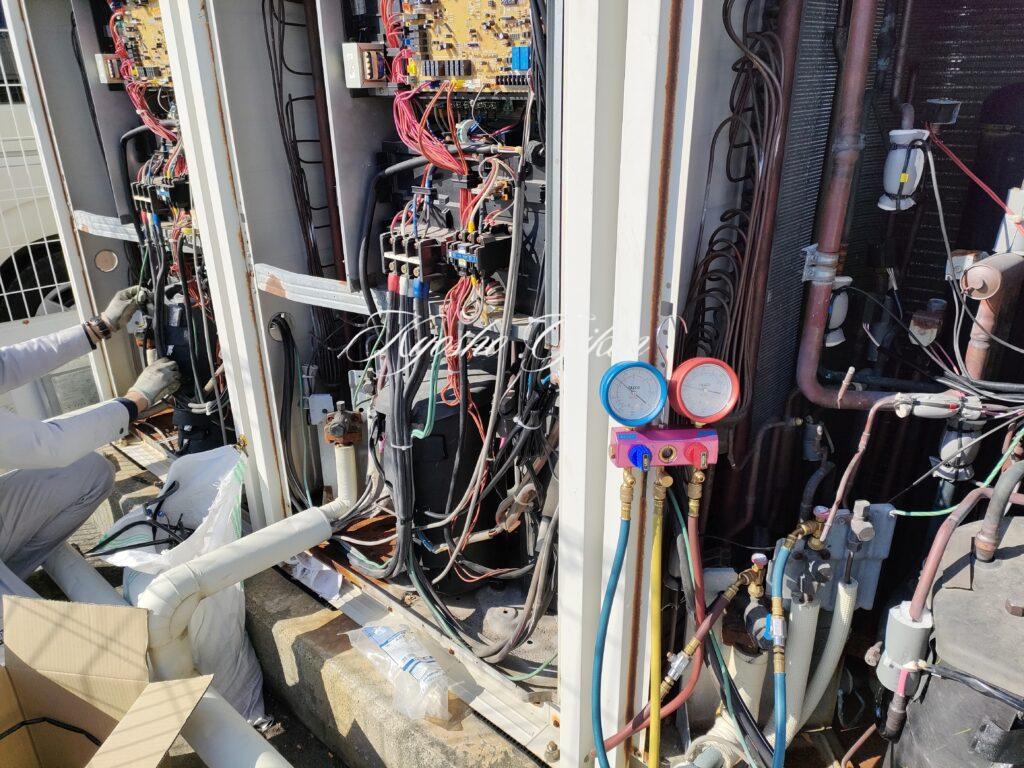 今回は、ダイキン工業製のビル用マルチエアコンの圧縮機絶縁不良・起動不良など3台故障している機器の修理作業を実施しました。