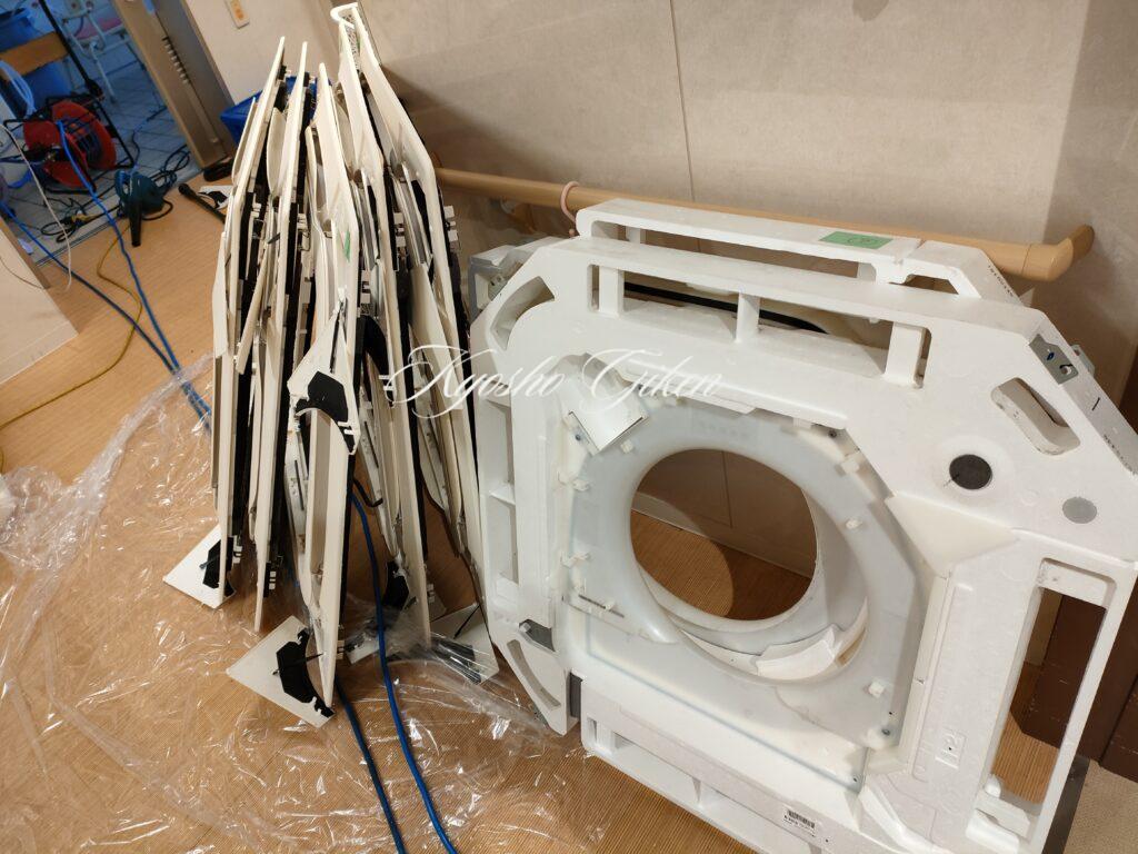 今回は、天カセエアコンの洗浄作業10台まとめて行いました。